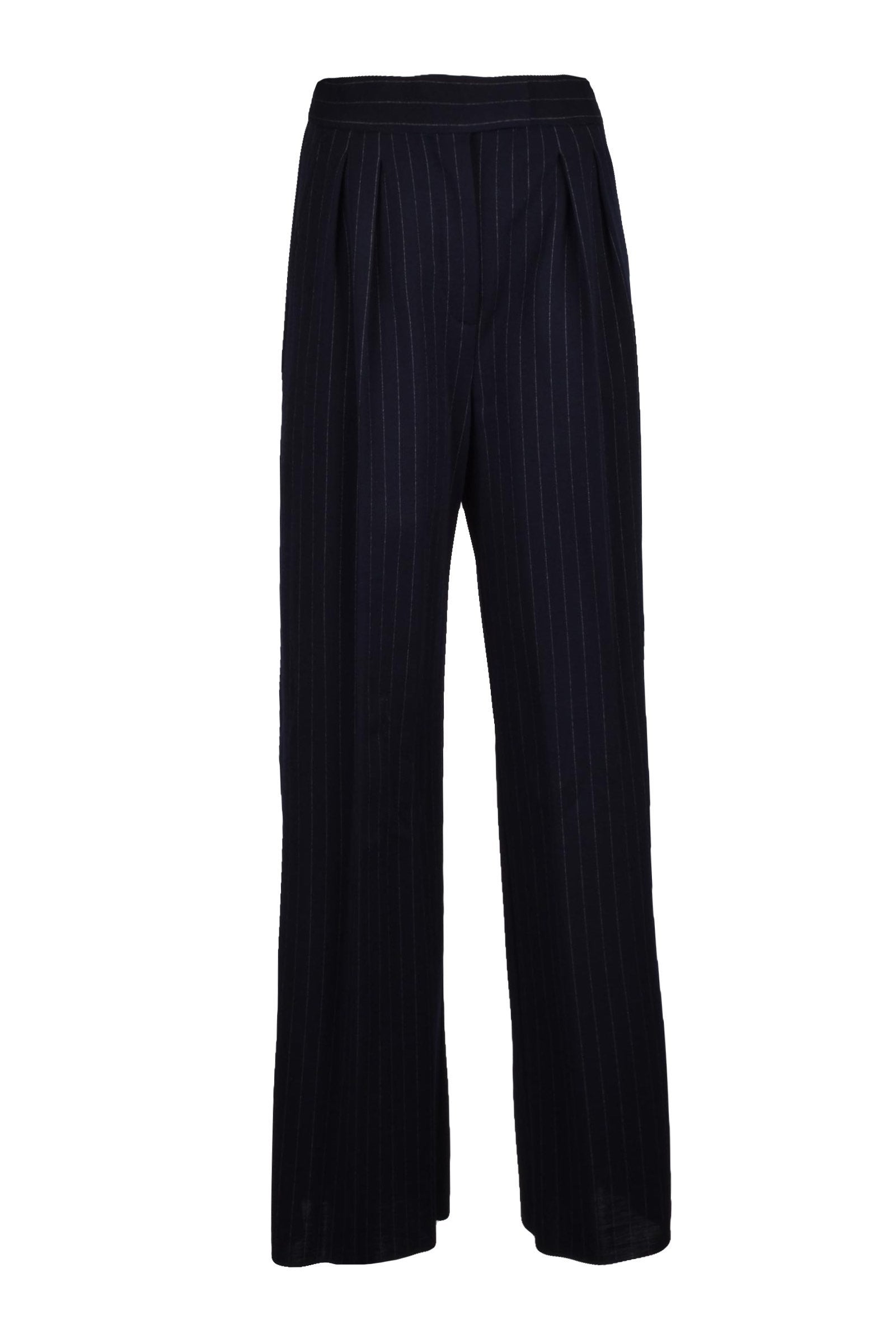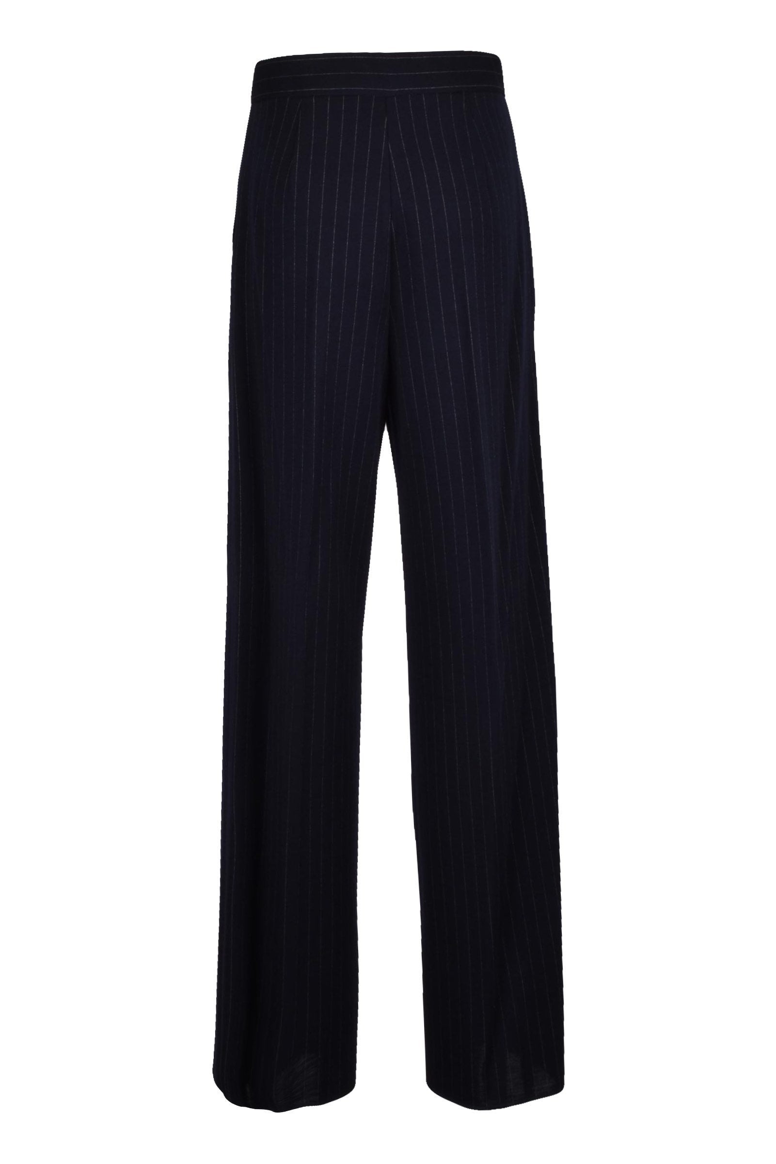 MODELLO: Gessato Classico In Lana, VITA: Alta Con Pinces, TASCHE: Si, CHIUSURA: Cerniera, GAMBA: Larga, DETTAGLI: Coulotte In Raso
