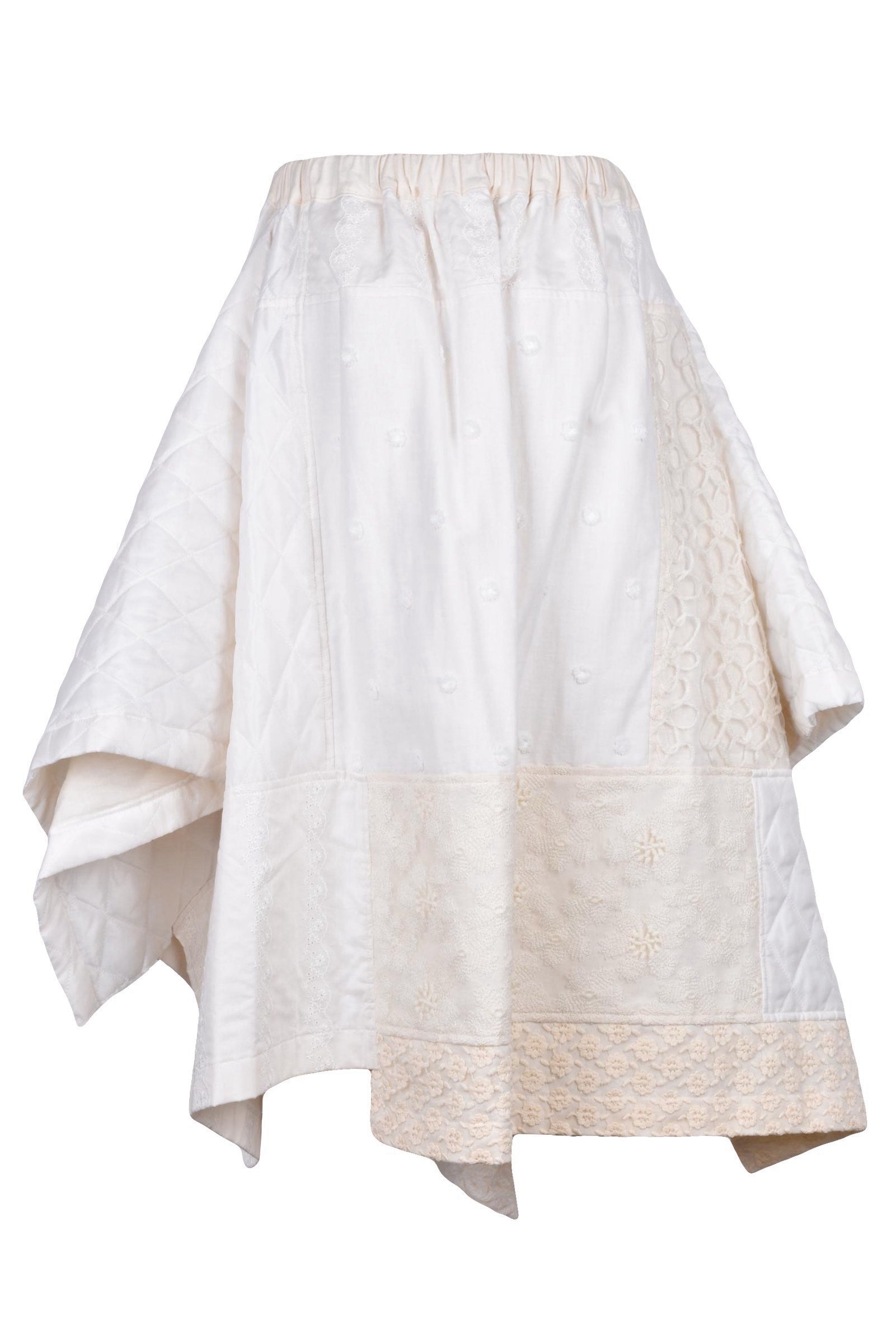 MODELLO: Gonna Lunga Asimmetrica, CHIUSURA: Elastico, TASCHE: Frontali, DETTAGLI: Inserti In Sangallo